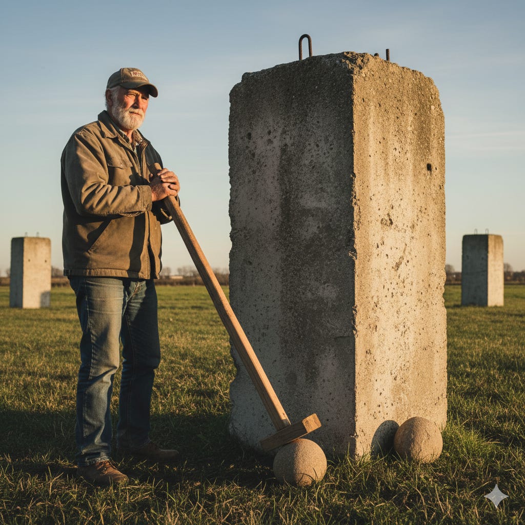 Wally is most famous for constructing a “Stonehenge-like” structure in his backyard using massive concrete blocks, and for moving that barn... an entire pole barn... across his property. He has demonstrated his ability to “walk” an entire pole barn across his property, by himself.